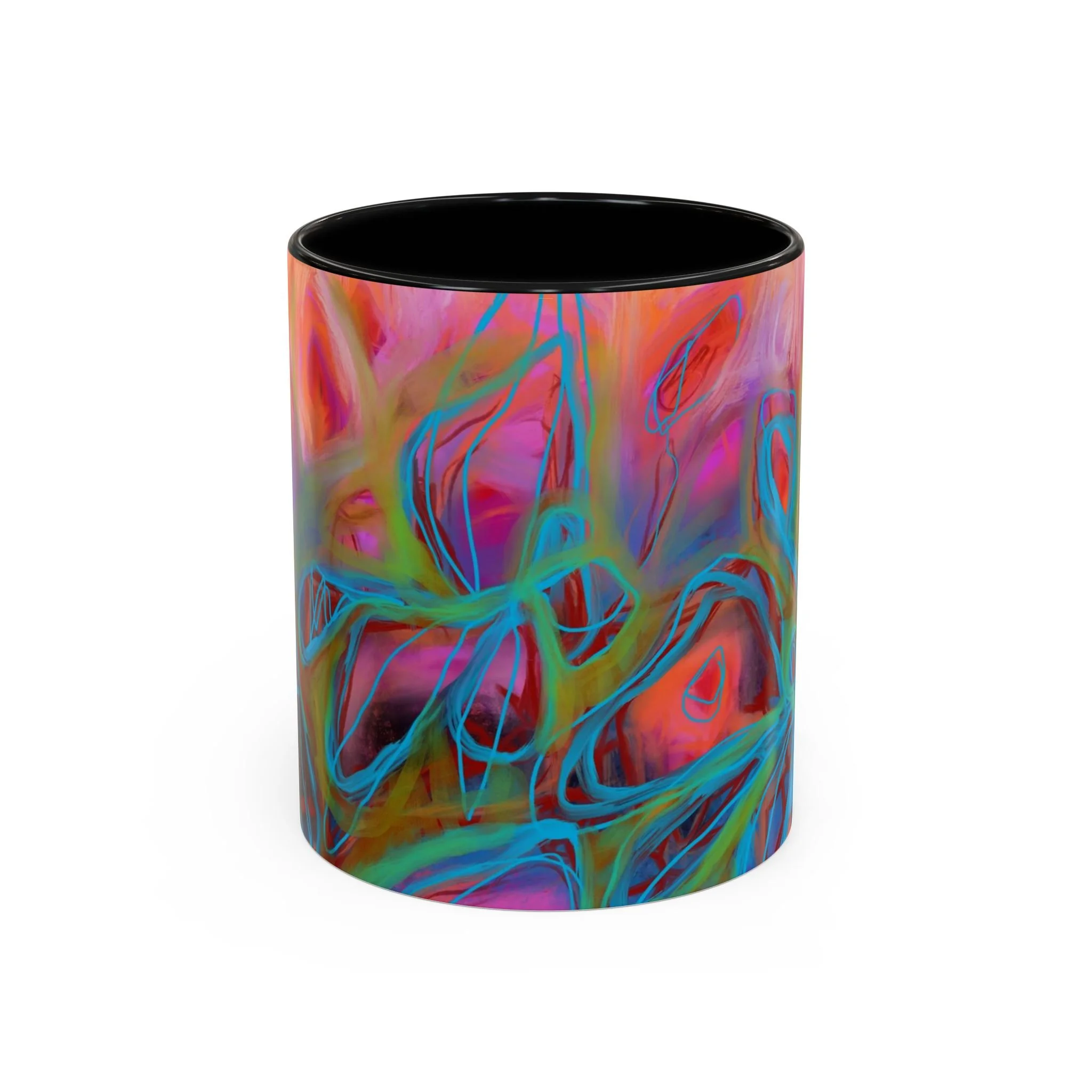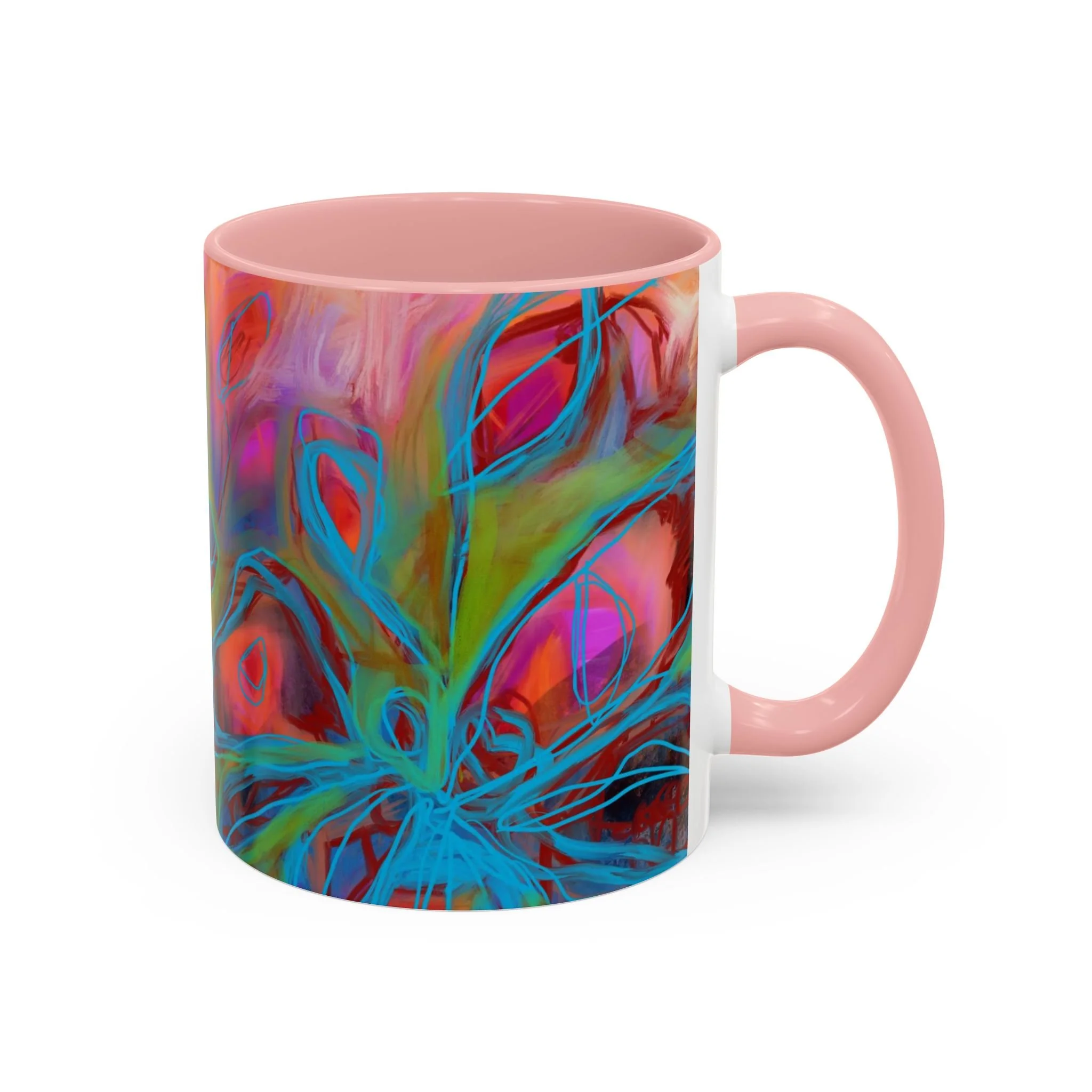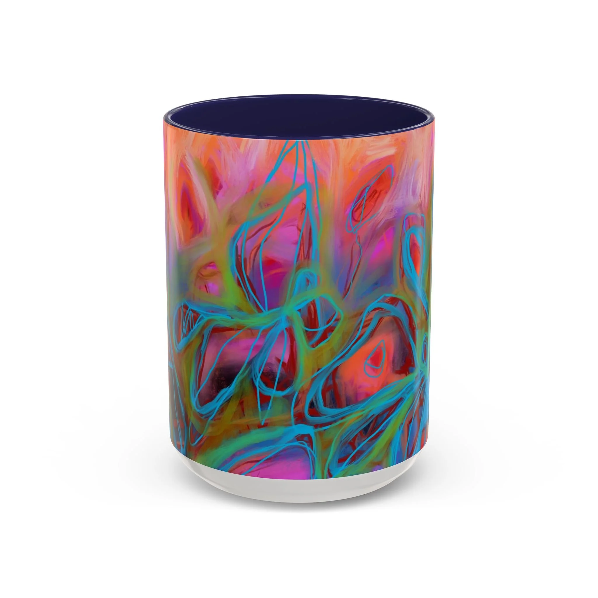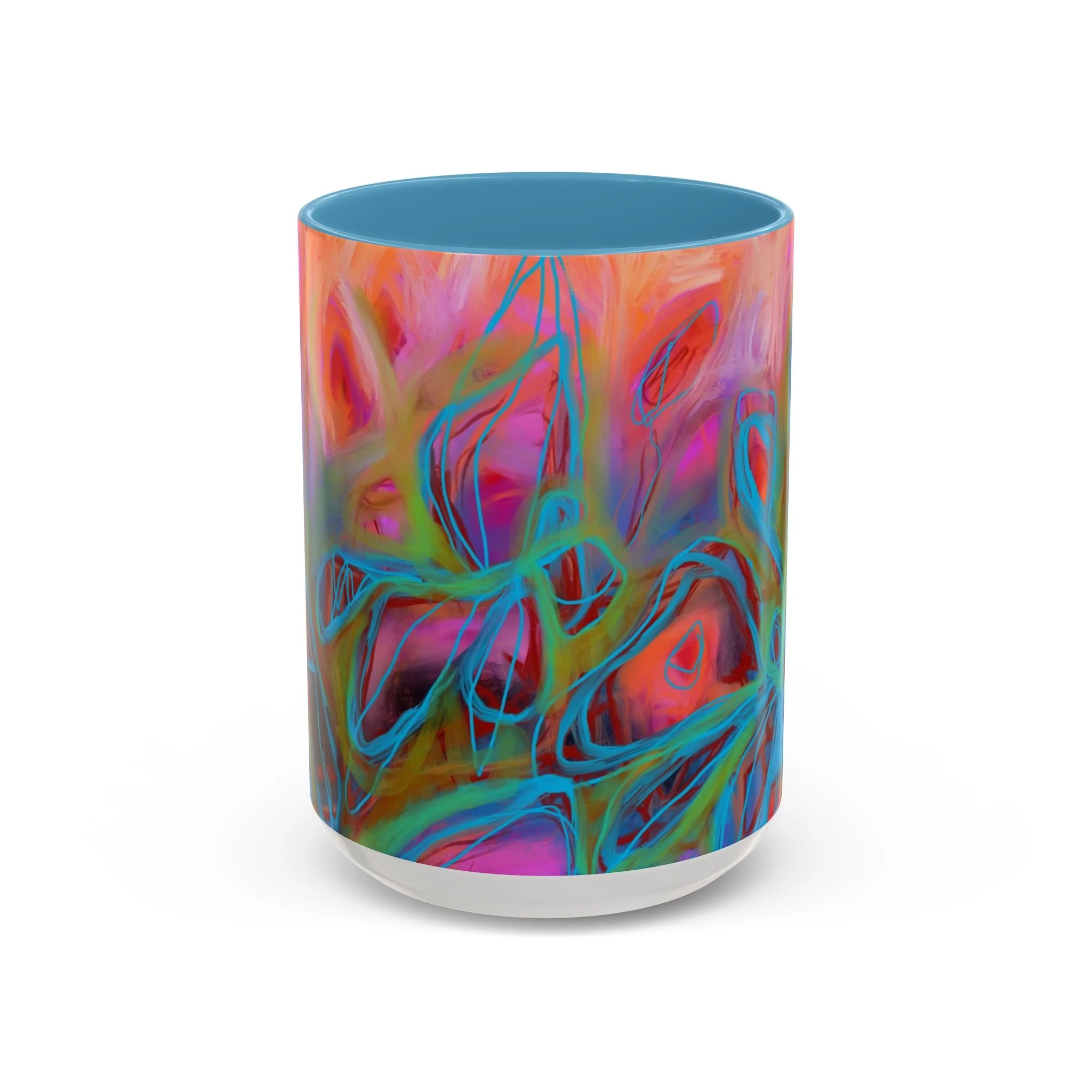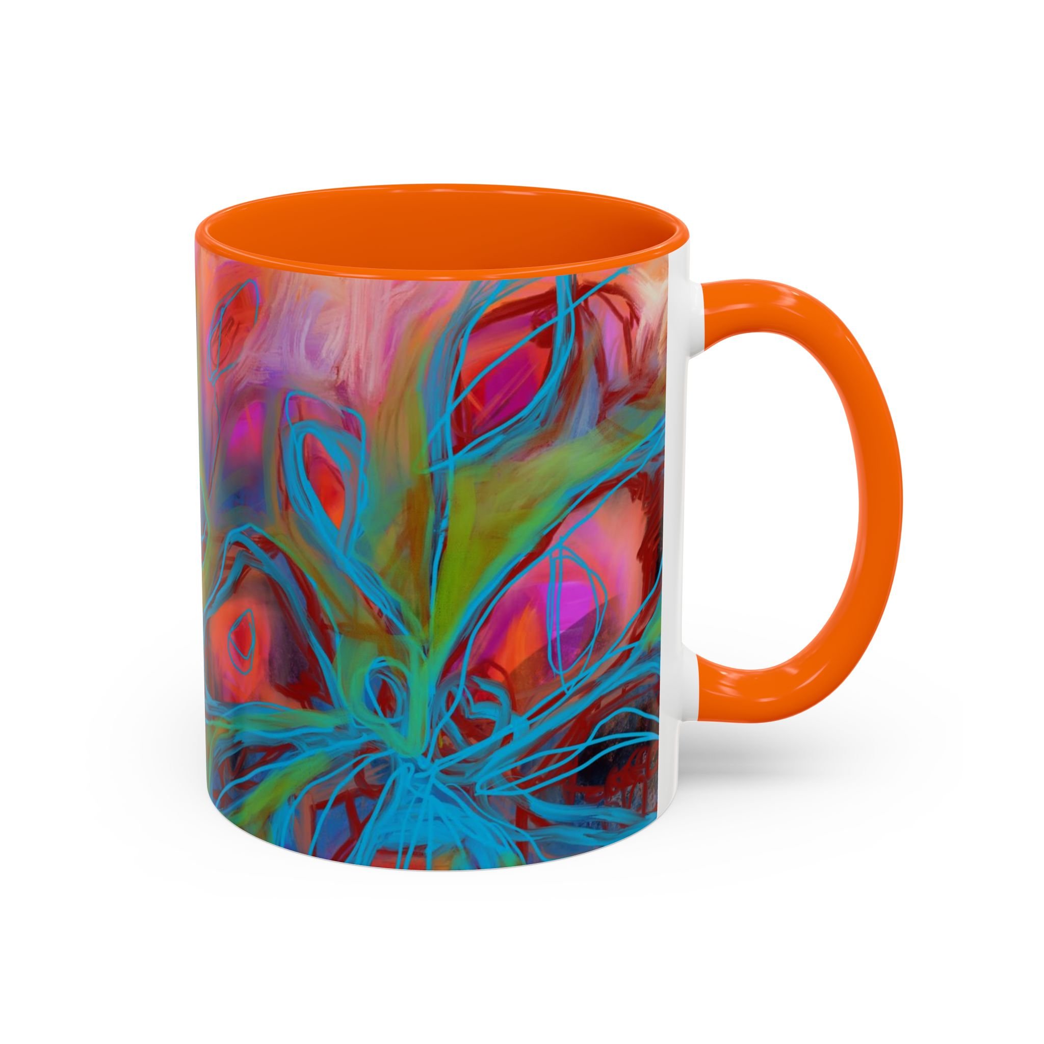 Bright, hand-drawn color dances wrap this ceramic mug like a small, warm sunrise. Swirls of magenta, teal, coral and gold create an energetic, painterly pattern that feels playful and alive. Hold it by the glossy C-handle and feel the contrast between the colored interior and the white exterior — a little moment of art for slow mornings, studio breaks, or late-night creative pulls. It’s sturdy enough for daily use, safe in the microwave and dishwasher, and vivid enough to keep the colors popping through your routine. This mug fits naturally on crowded desks, beside sketchbooks, or in cozy kitchen nooks where color and creativity matter.