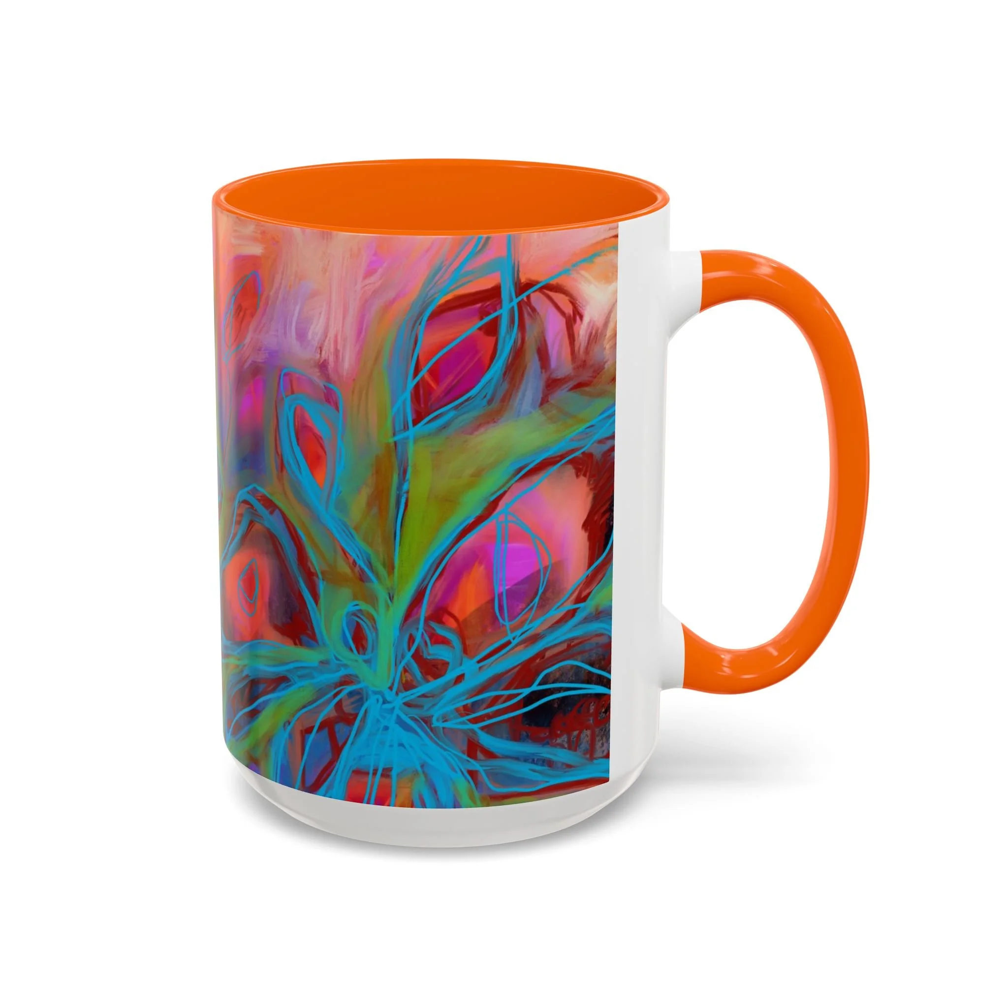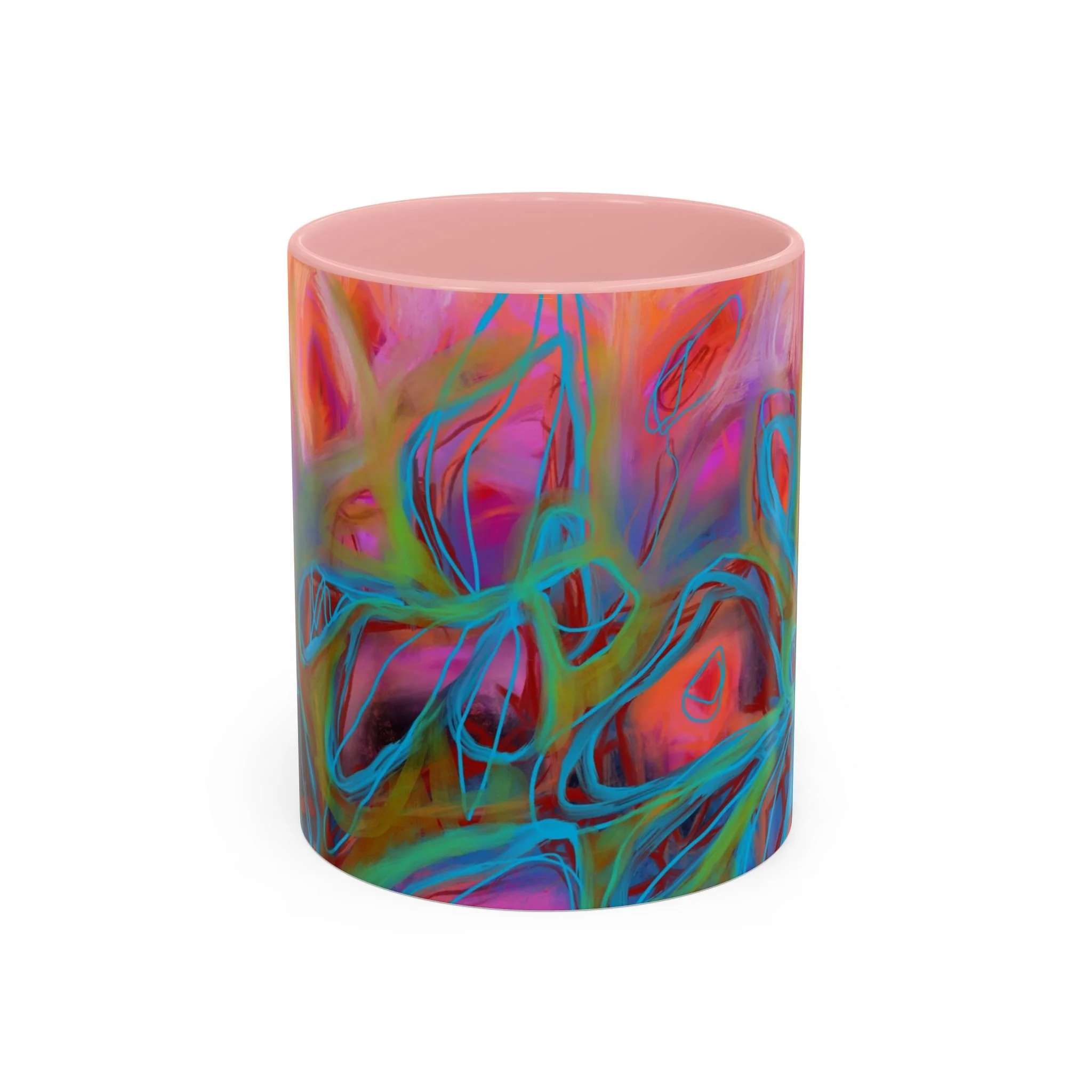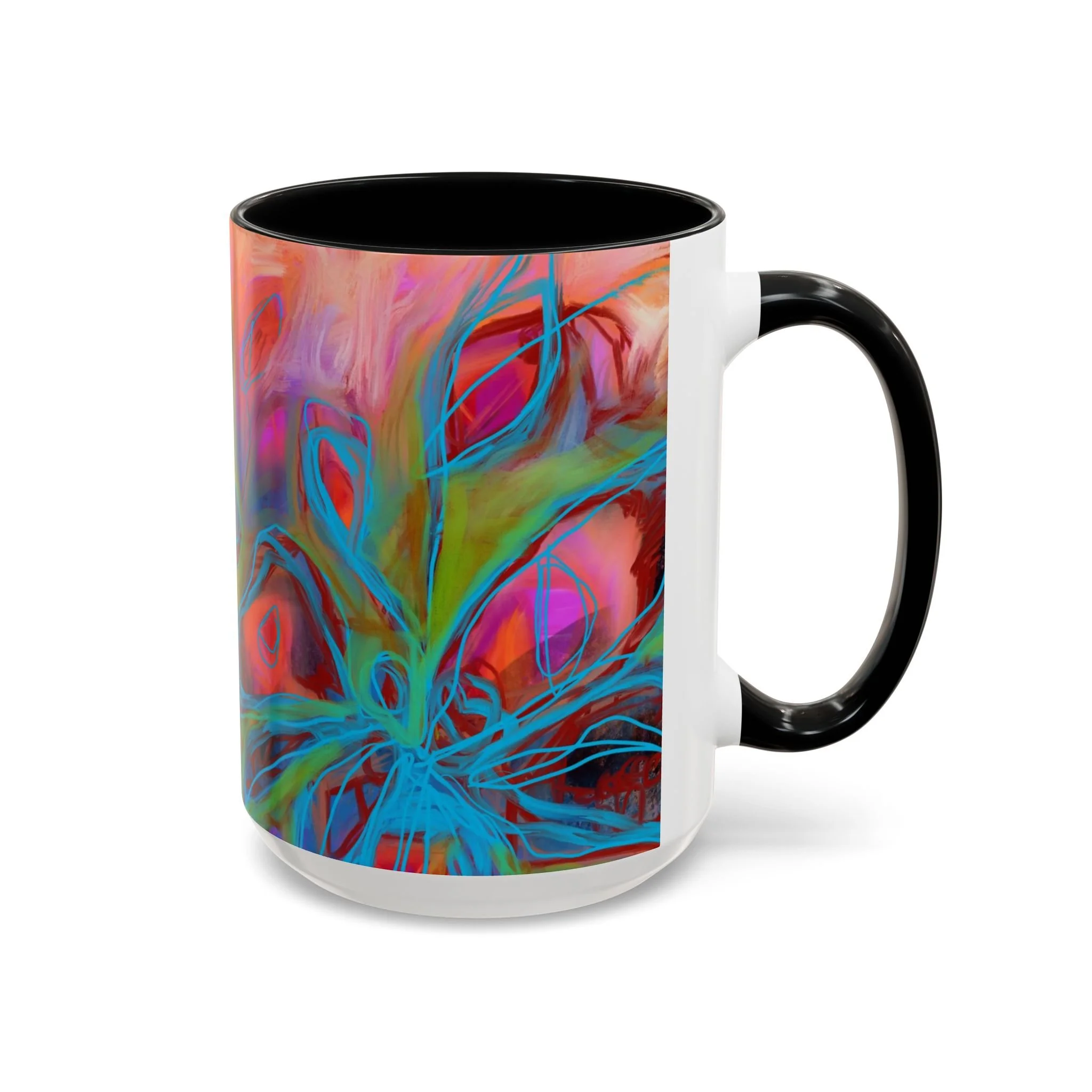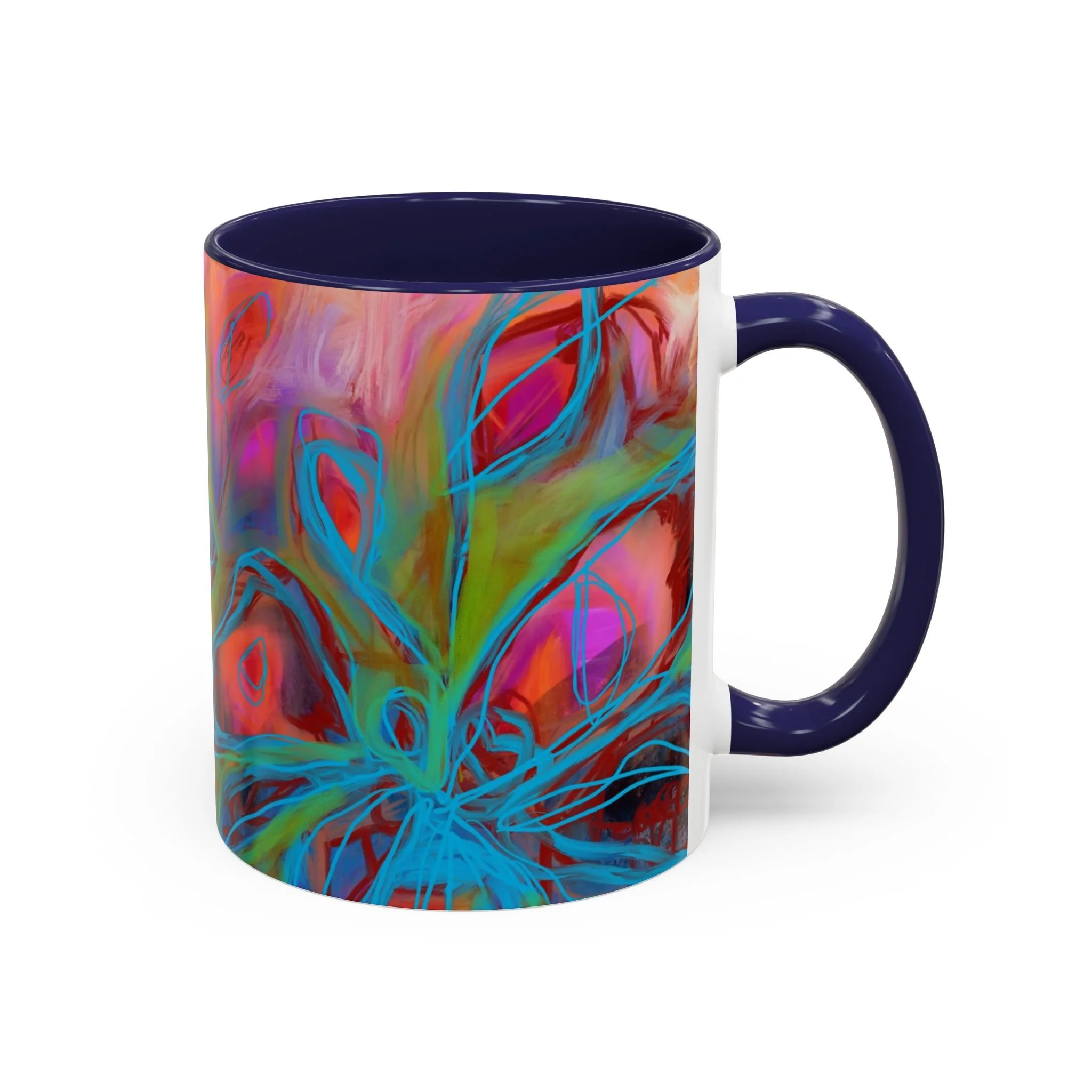 Bright, hand-drawn color dances wrap this ceramic mug like a small, warm sunrise. Swirls of magenta, teal, coral and gold create an energetic, painterly pattern that feels playful and alive. Hold it by the glossy C-handle and feel the contrast between the colored interior and the white exterior — a little moment of art for slow mornings, studio breaks, or late-night creative pulls. It’s sturdy enough for daily use, safe in the microwave and dishwasher, and vivid enough to keep the colors popping through your routine. This mug fits naturally on crowded desks, beside sketchbooks, or in cozy kitchen nooks where color and creativity matter.