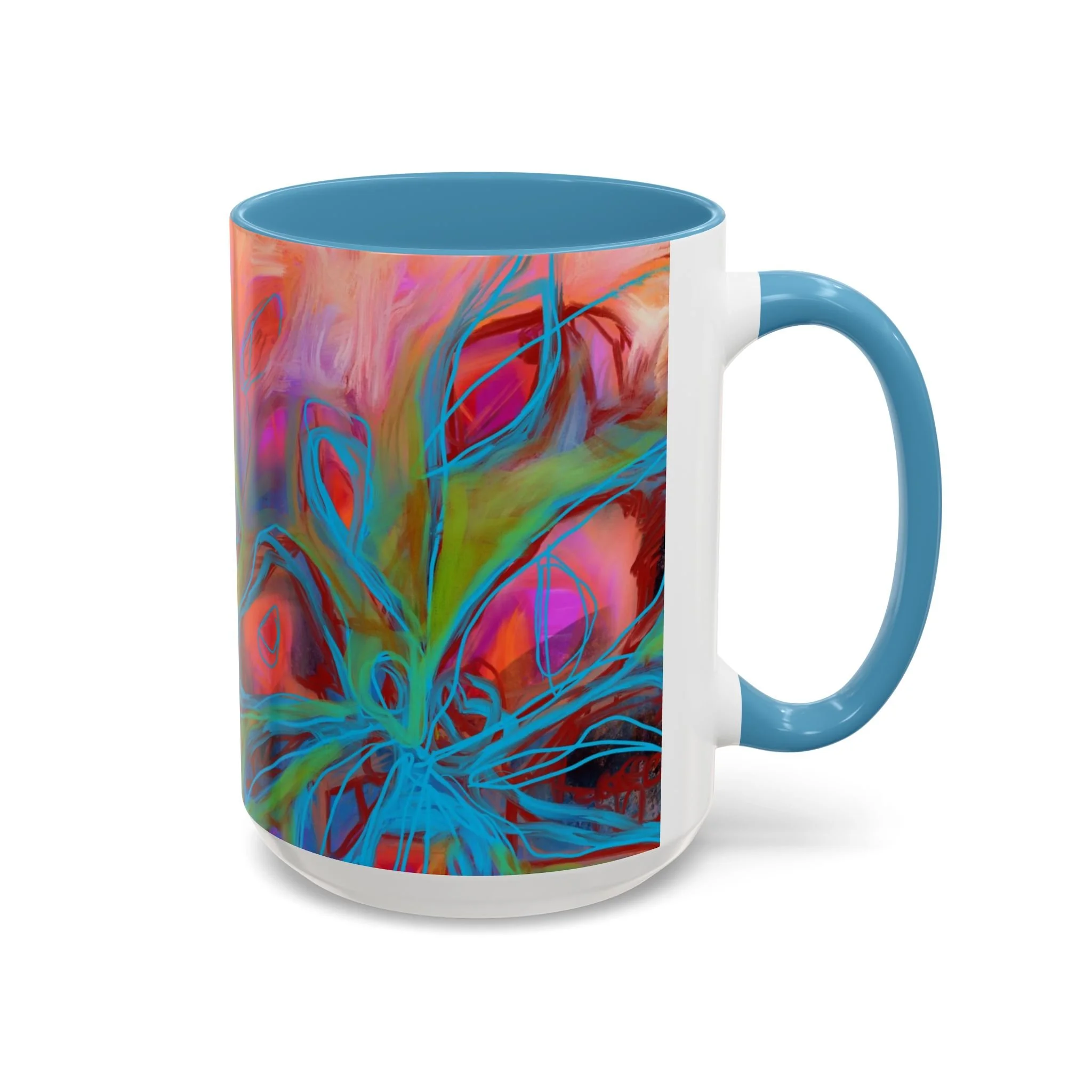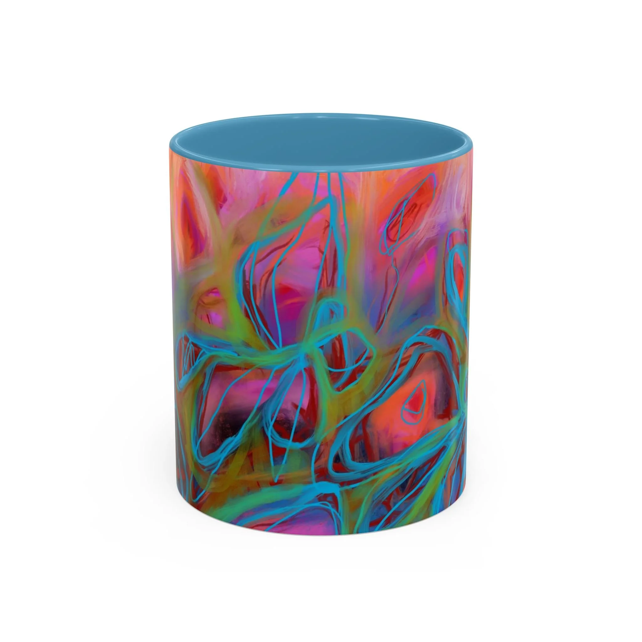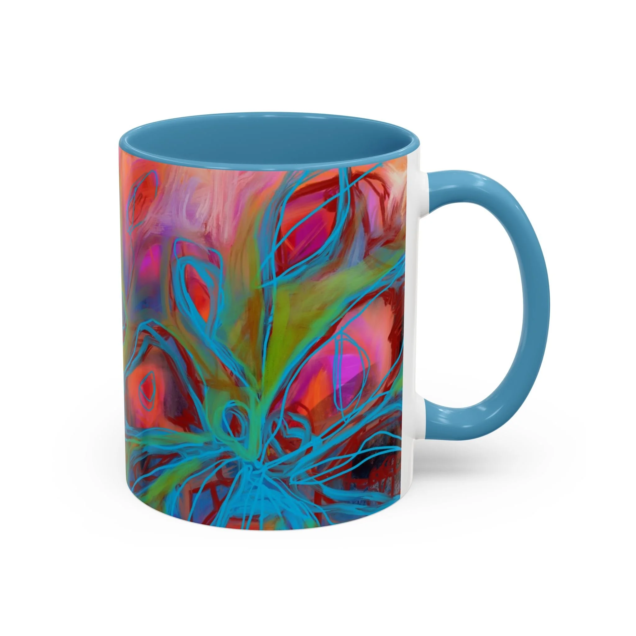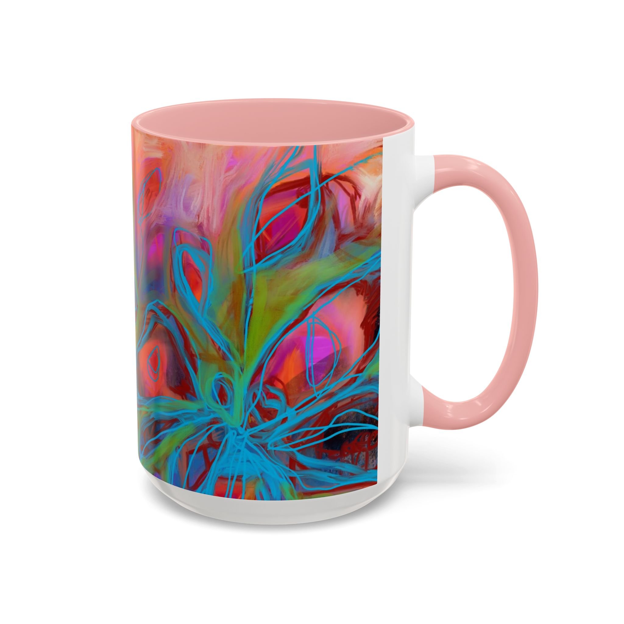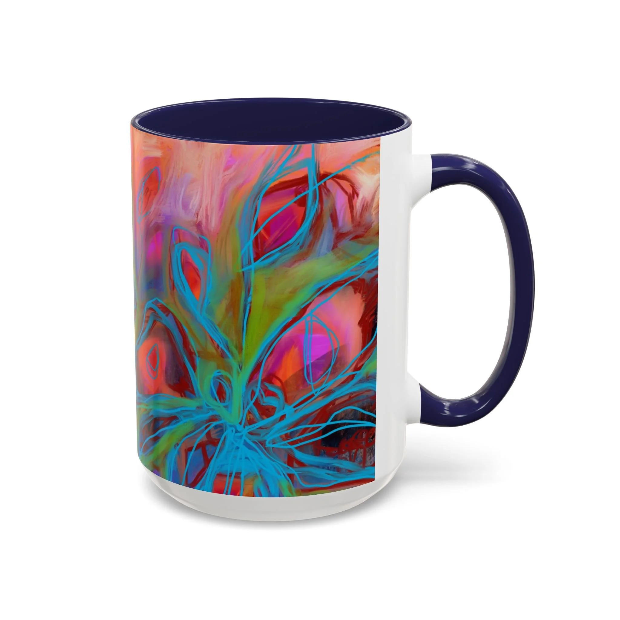 Bright, hand-drawn color dances wrap this ceramic mug like a small, warm sunrise. Swirls of magenta, teal, coral and gold create an energetic, painterly pattern that feels playful and alive. Hold it by the glossy C-handle and feel the contrast between the colored interior and the white exterior — a little moment of art for slow mornings, studio breaks, or late-night creative pulls. It’s sturdy enough for daily use, safe in the microwave and dishwasher, and vivid enough to keep the colors popping through your routine. This mug fits naturally on crowded desks, beside sketchbooks, or in cozy kitchen nooks where color and creativity matter.