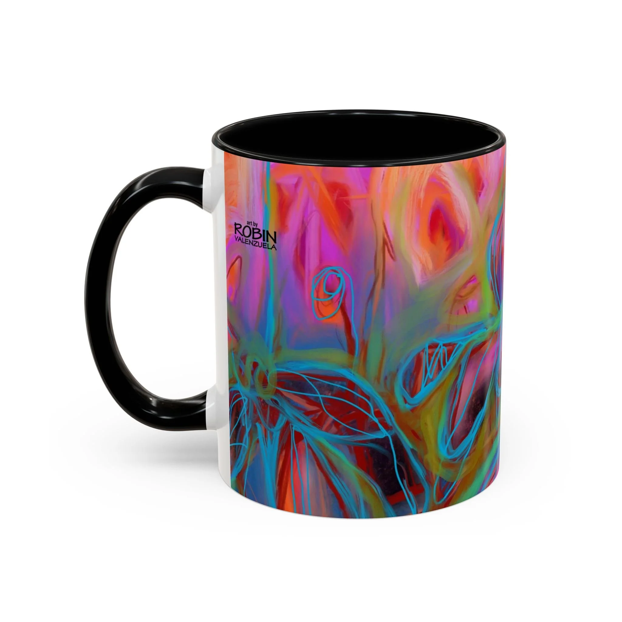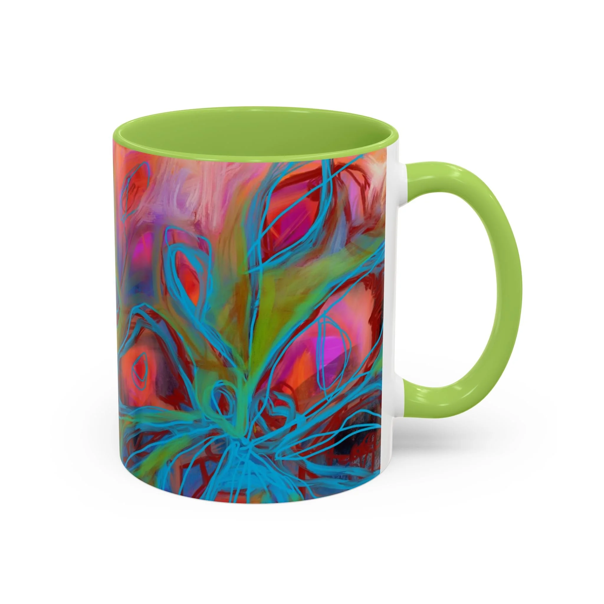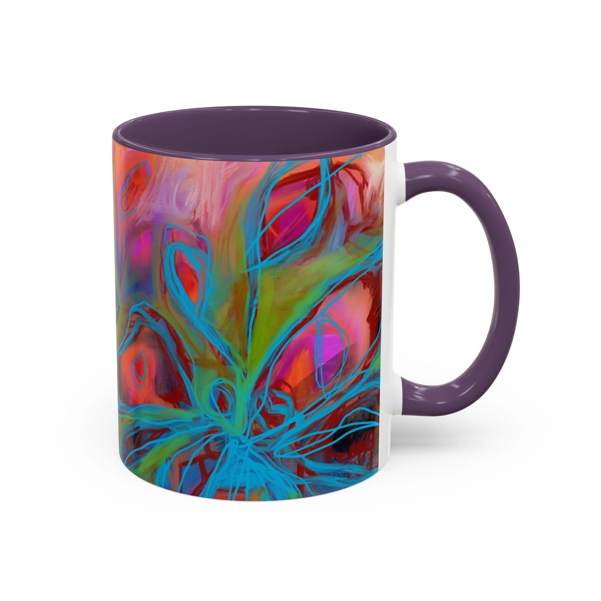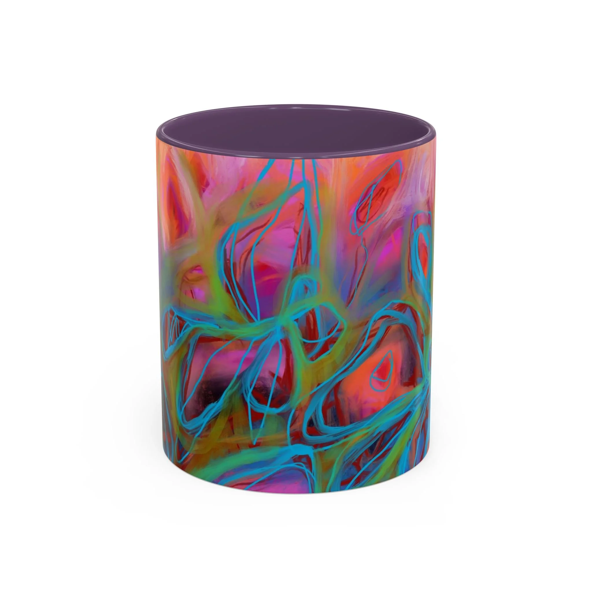 Bright, hand-drawn color dances wrap this ceramic mug like a small, warm sunrise. Swirls of magenta, teal, coral and gold create an energetic, painterly pattern that feels playful and alive. Hold it by the glossy C-handle and feel the contrast between the colored interior and the white exterior — a little moment of art for slow mornings, studio breaks, or late-night creative pulls. It’s sturdy enough for daily use, safe in the microwave and dishwasher, and vivid enough to keep the colors popping through your routine. This mug fits naturally on crowded desks, beside sketchbooks, or in cozy kitchen nooks where color and creativity matter.
