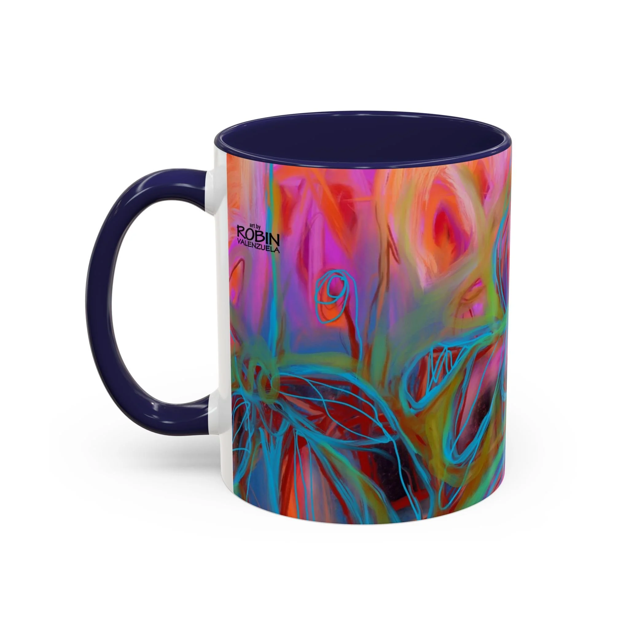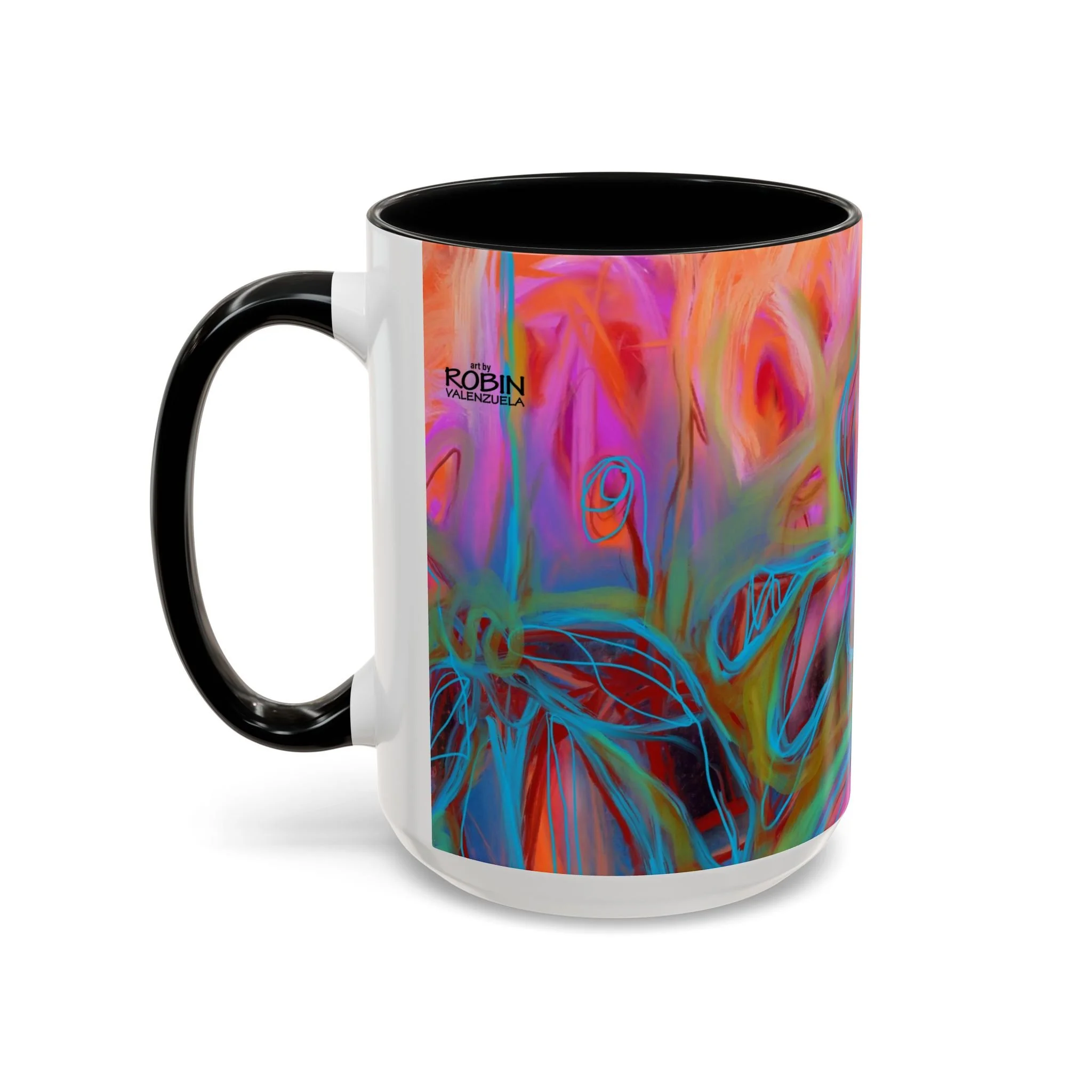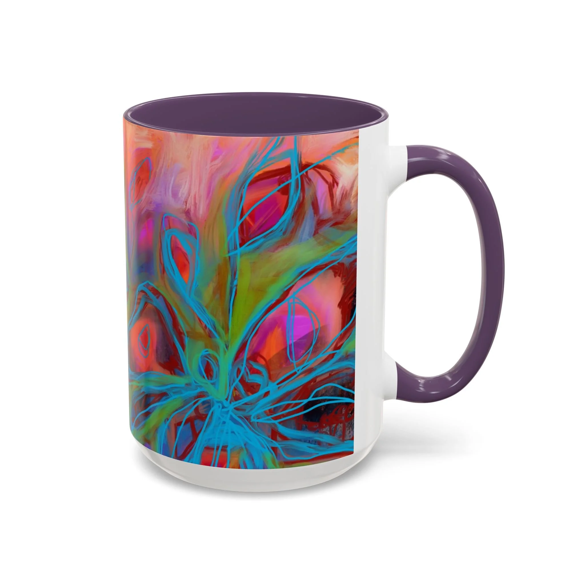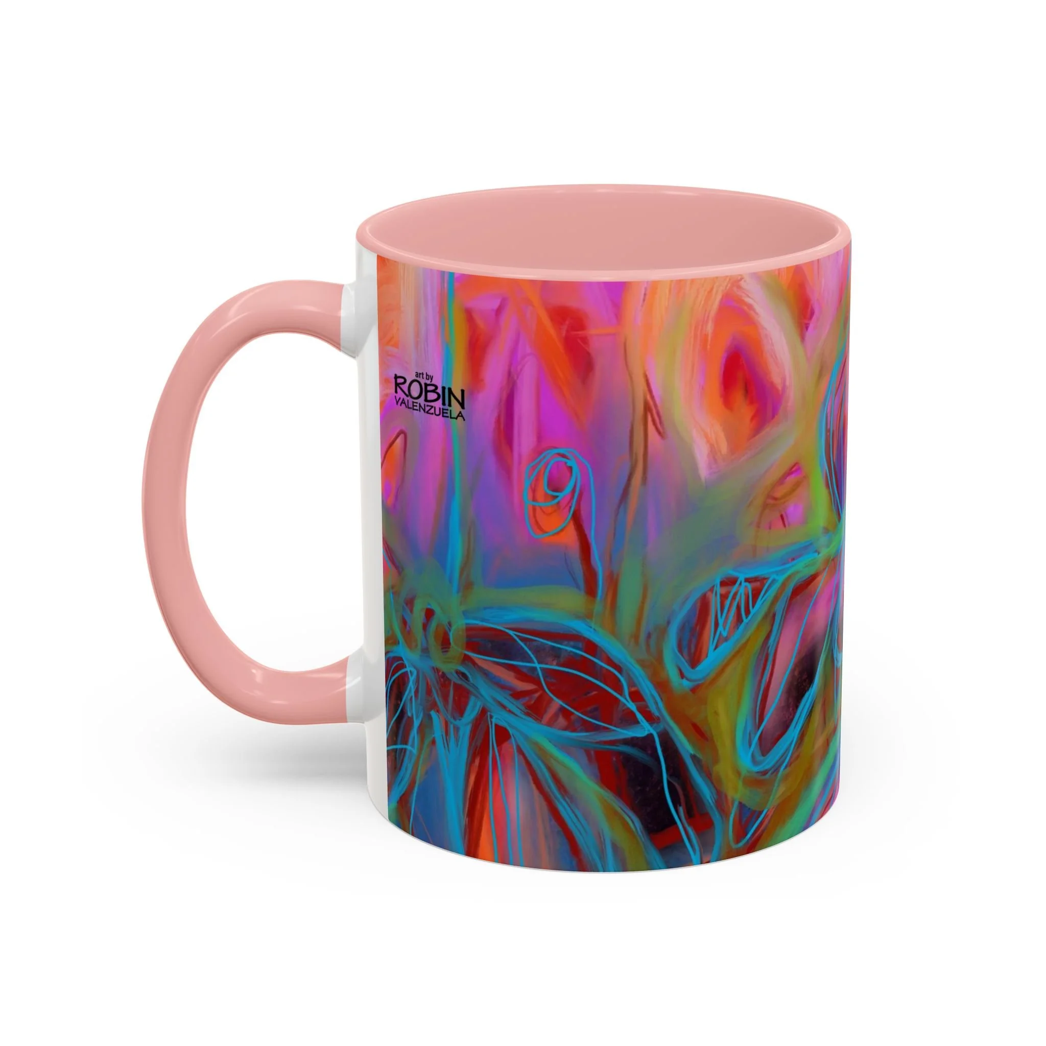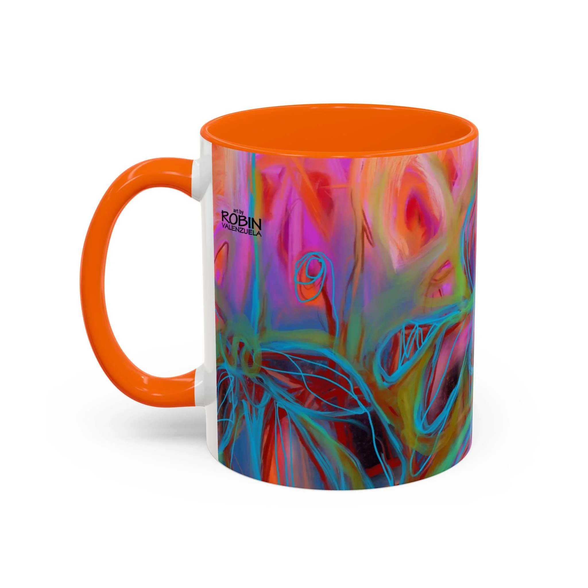 Bright, hand-drawn color dances wrap this ceramic mug like a small, warm sunrise. Swirls of magenta, teal, coral and gold create an energetic, painterly pattern that feels playful and alive. Hold it by the glossy C-handle and feel the contrast between the colored interior and the white exterior — a little moment of art for slow mornings, studio breaks, or late-night creative pulls. It’s sturdy enough for daily use, safe in the microwave and dishwasher, and vivid enough to keep the colors popping through your routine. This mug fits naturally on crowded desks, beside sketchbooks, or in cozy kitchen nooks where color and creativity matter.