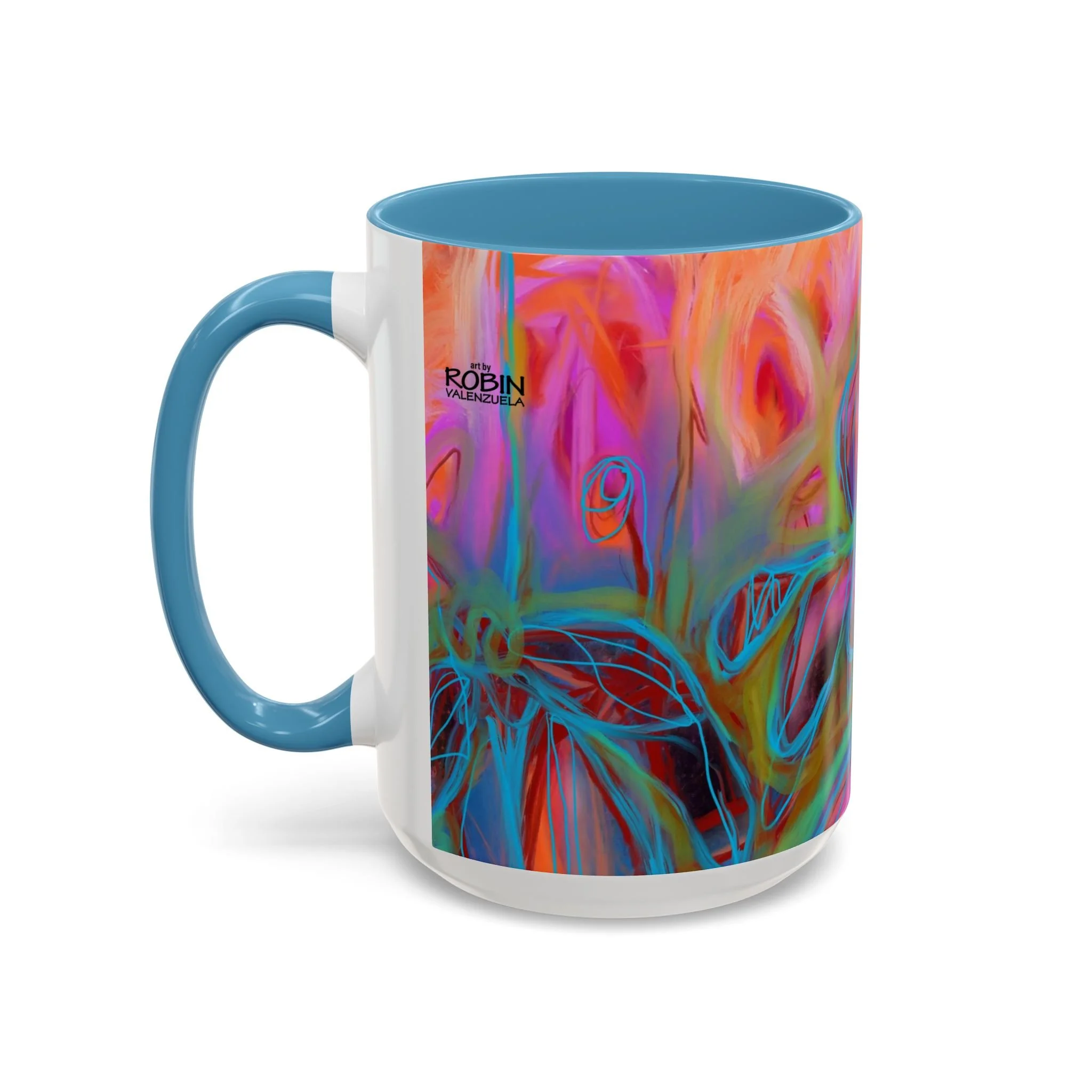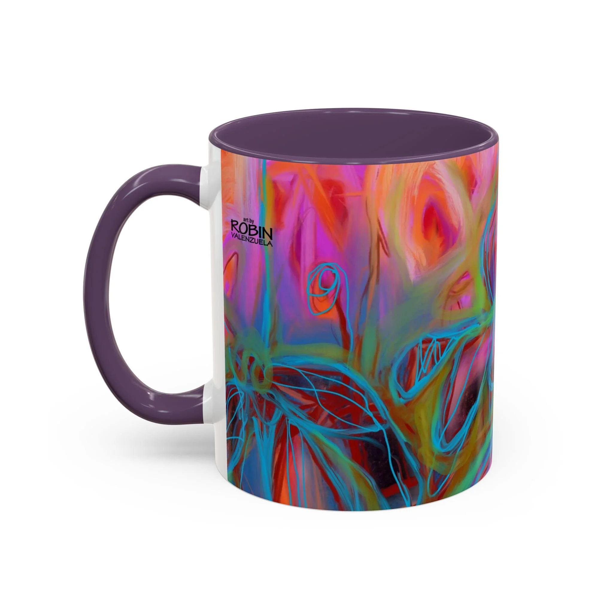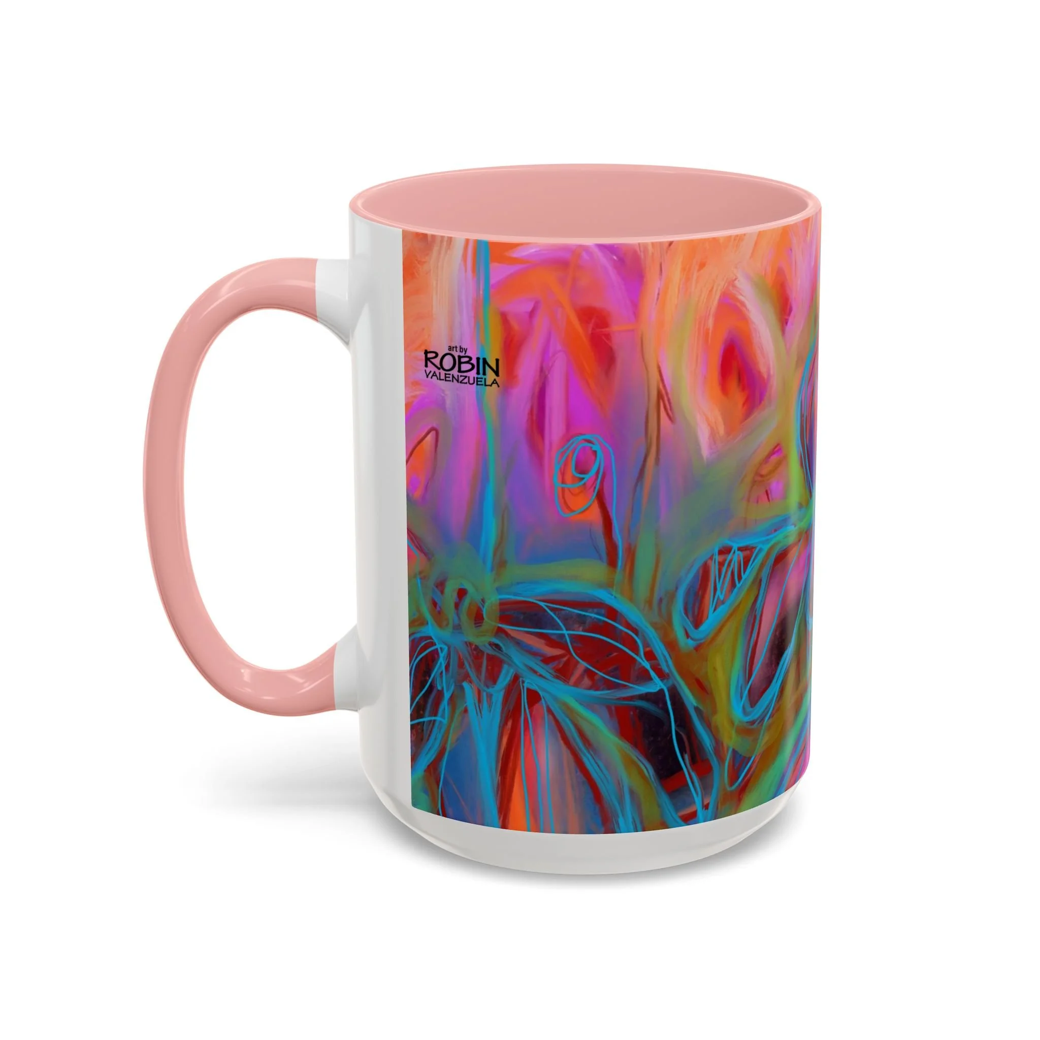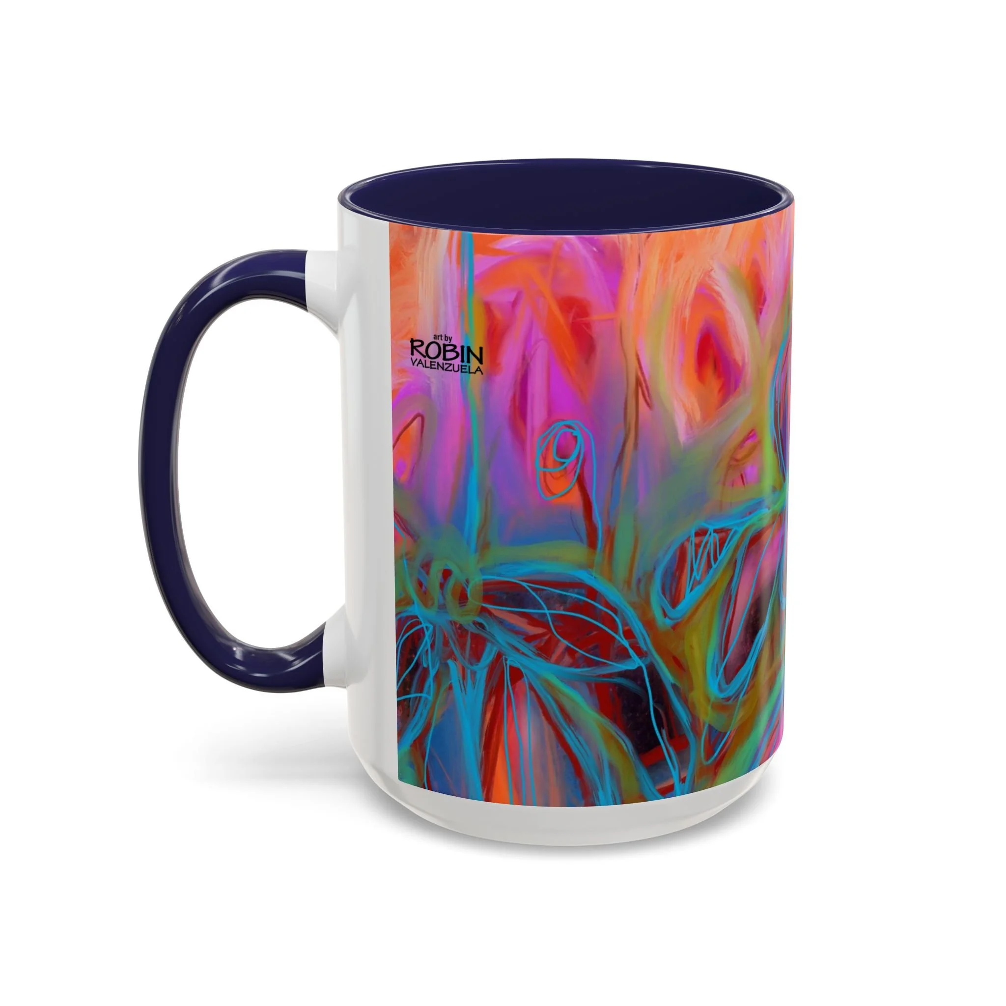 Bright, hand-drawn color dances wrap this ceramic mug like a small, warm sunrise. Swirls of magenta, teal, coral and gold create an energetic, painterly pattern that feels playful and alive. Hold it by the glossy C-handle and feel the contrast between the colored interior and the white exterior — a little moment of art for slow mornings, studio breaks, or late-night creative pulls. It’s sturdy enough for daily use, safe in the microwave and dishwasher, and vivid enough to keep the colors popping through your routine. This mug fits naturally on crowded desks, beside sketchbooks, or in cozy kitchen nooks where color and creativity matter.